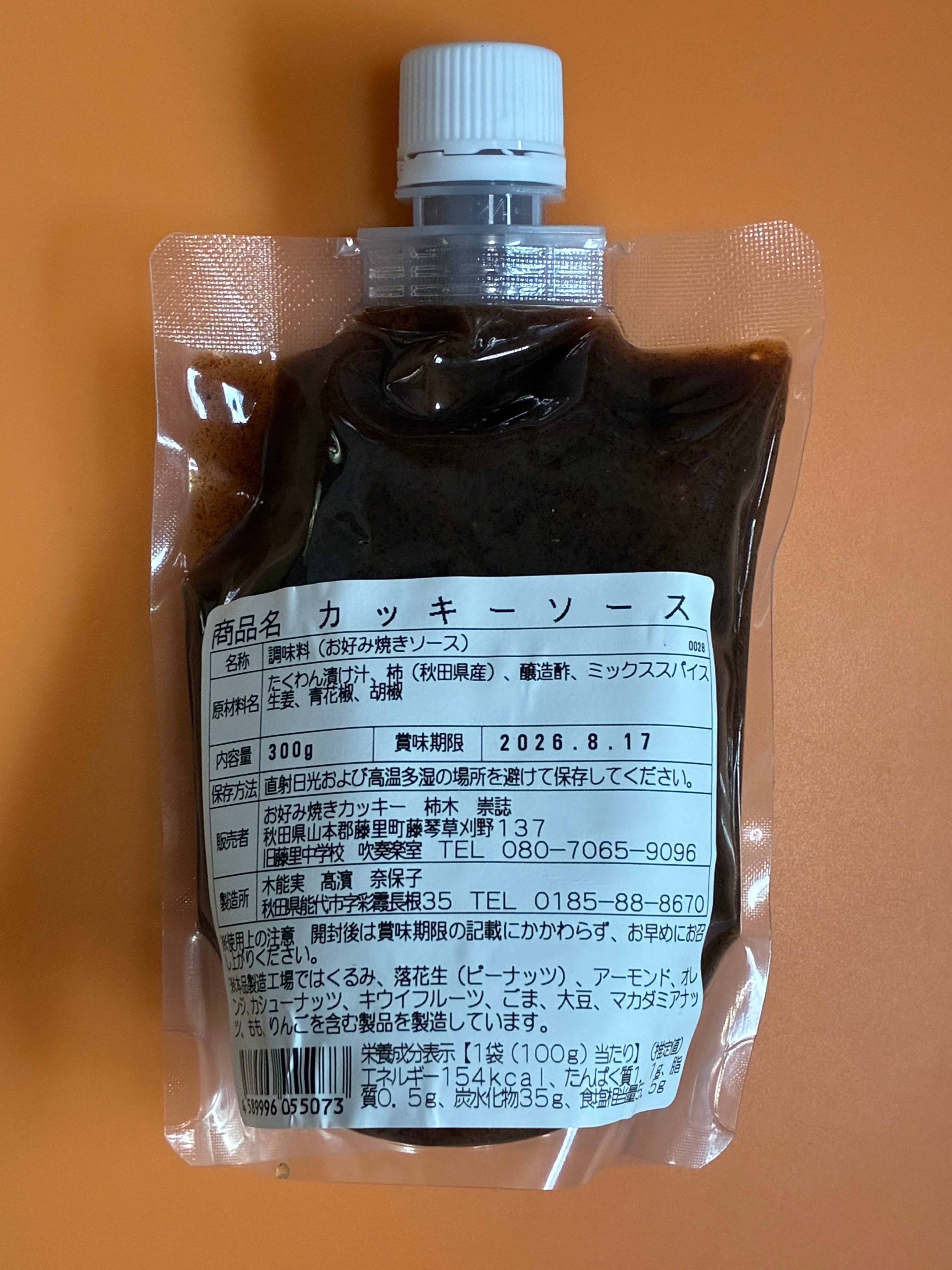 キッチンカーで使用しているお好み焼きのソースです。甘じょっぱいいぶりがっこの漬け汁に柿の甘さが加わったフルーティーでスモーキーな特製ソース。